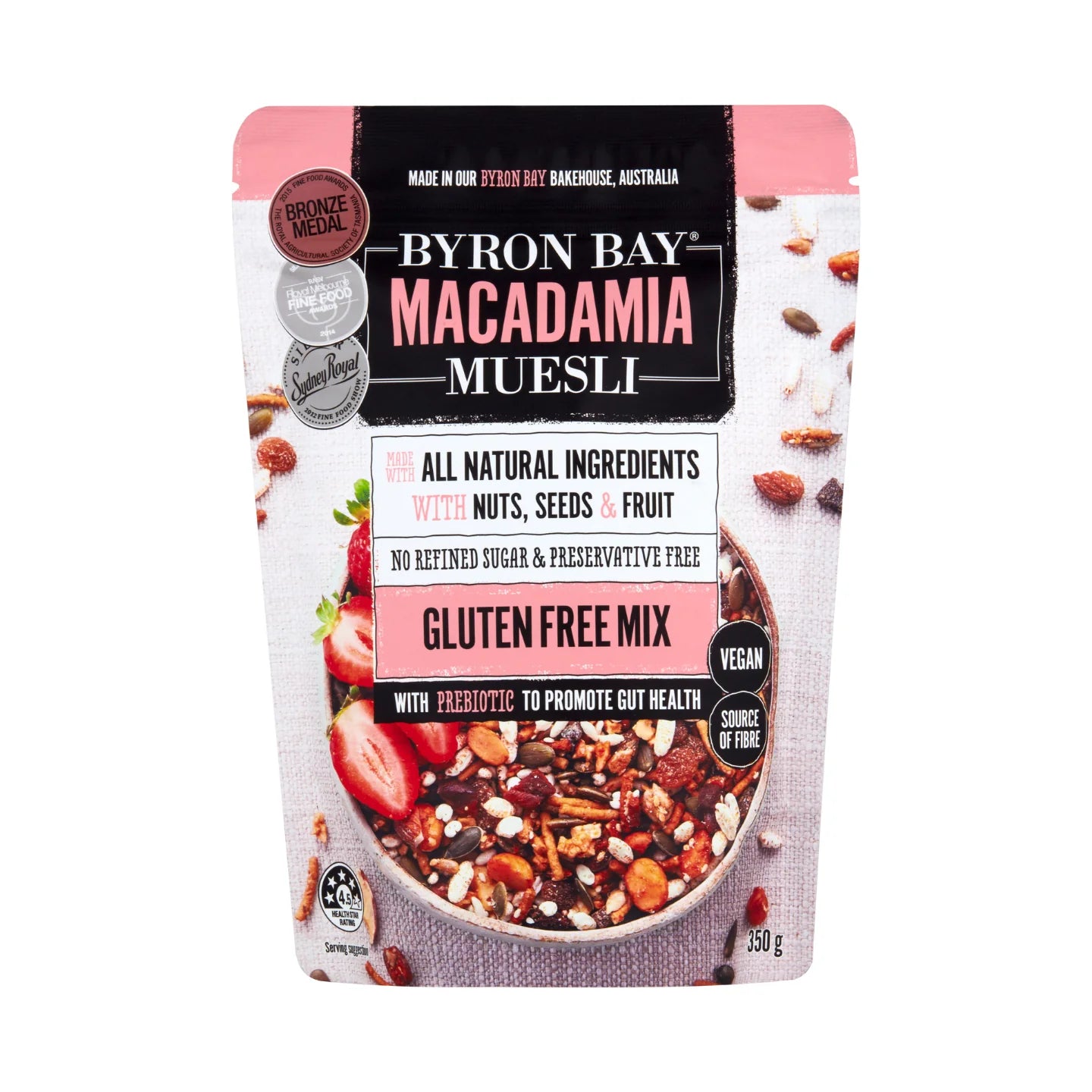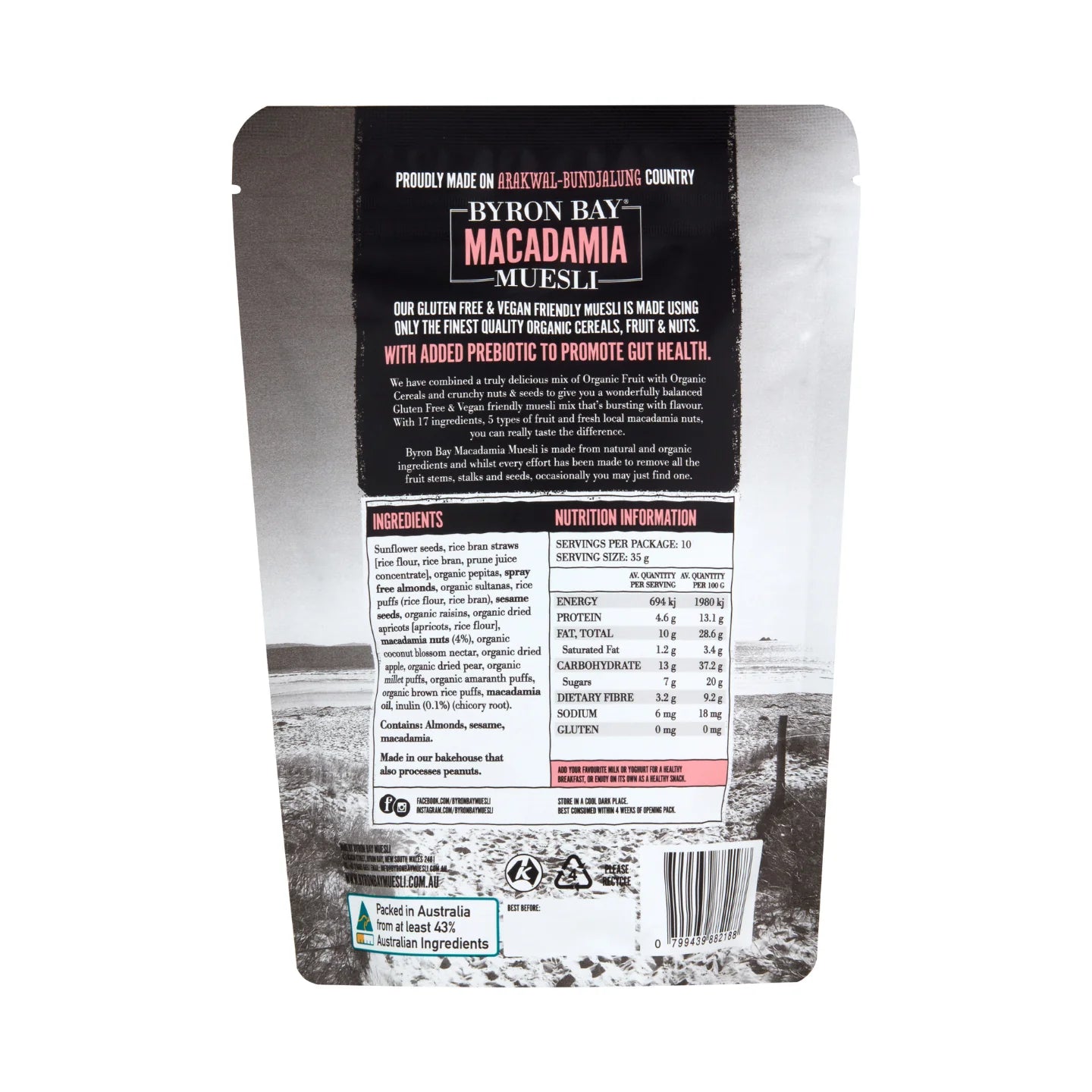Byron Bay Macadamia Muesli Gluten Free Fruit and Nut Muesli are made using only the finest quality Australian organic cereals organic and biodynamic fruit and most importantly don't add sugar or nasty preservatives. Combined a truly delicious mix of organic and biodynamic fruit with organic cereals and crunchy nuts and seeds to give you a wonderfully balanced gluten-free super mix that's bursting with flavour. With 18 ingredients, 5 types of fruit and fresh macadamia nuts and honey, you can really taste the difference.