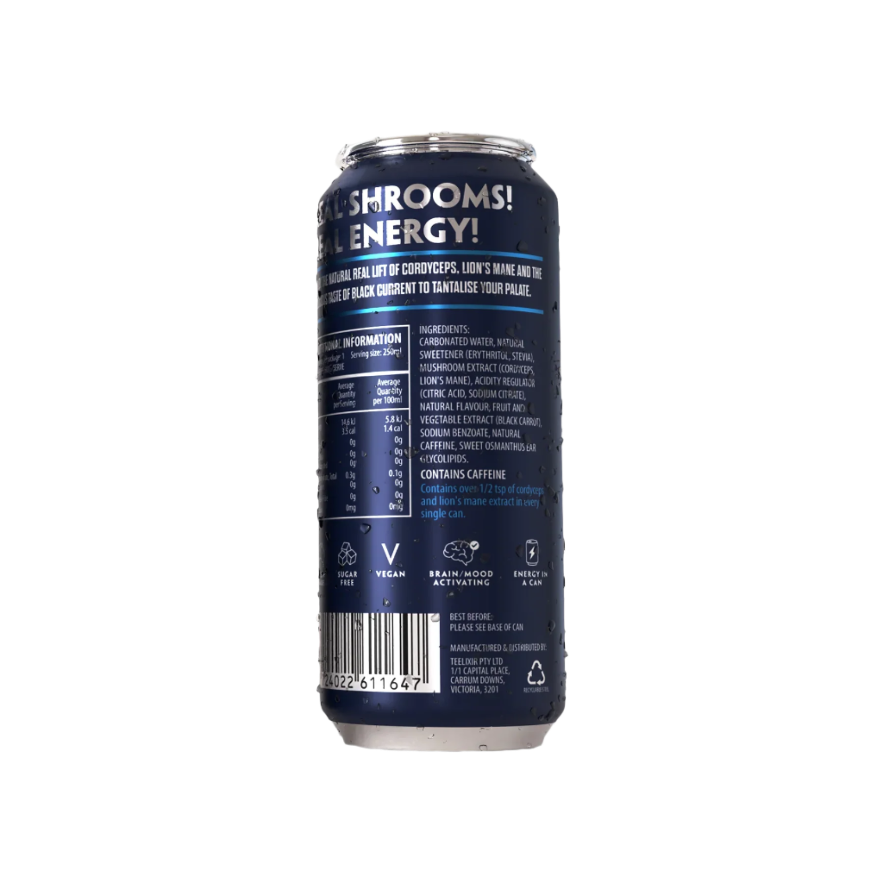 Carbonated Water, Natural Sweetener (Erythritol, Stevia), Mushroom Extracts (Cordyceps, Lions Mane), Acidity Regulator (Citric Acid, Sodium Citrate), Natural Flavour, Fruit and Vegetable Extract (Blackcurrant) Sodium Benzoate, Natural Caffeine, Sweet Osmanthusear Glycolipids.