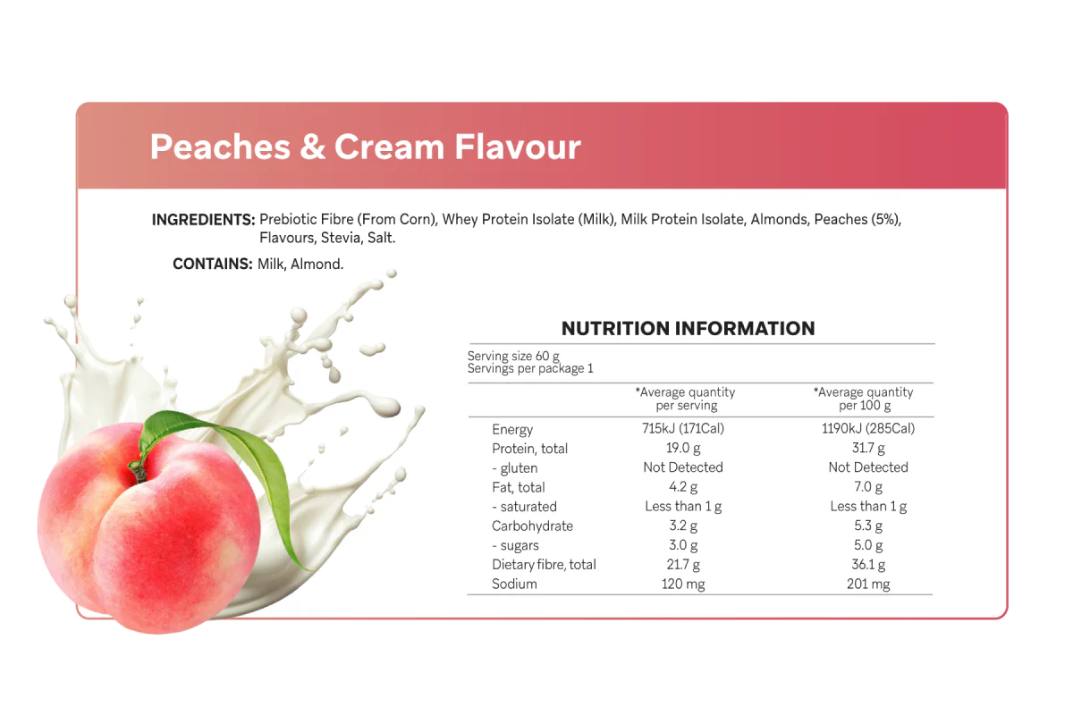 Prebiotic Fibre (From Corn), Whey Protein Isolate, Milk Protein Isolate, Almonds, Peaches, Flavours, Stevia, Salt