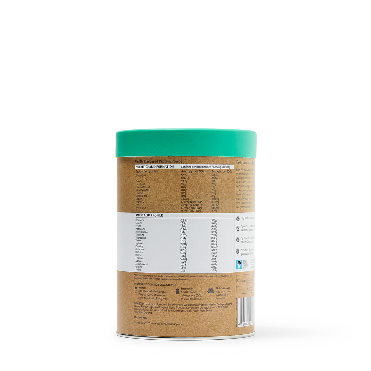 Organic Sprouted & Fermented Golden Pea Protein*, Marine Collagen, Natural Flavour, Digestive Enzyme Blend (Amylase, Protease, Lipase, Lactase, Cellulase), Organic Stevia Leaf Extract*, Wildcrafted Sea Buckthorn Juice*, Monk Fruit Extract. *Certified Organic