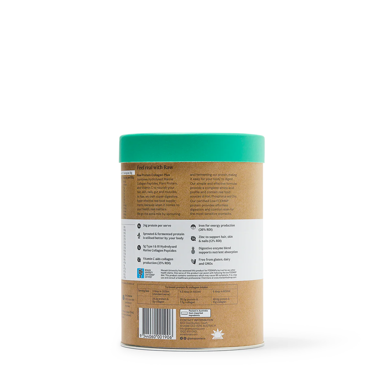 Each serve contains 5000mg of highly bioavailable Type I & III Hydrolysed Marine Collagen Peptides and up to 24g of organic sprouted and fermented plant protein.